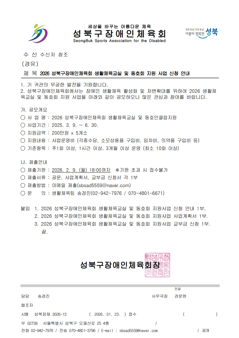 2026 상반기 성북구장애인체육회 생활체육교실 및 동호회 지원 사업 공모 안내드립니다.