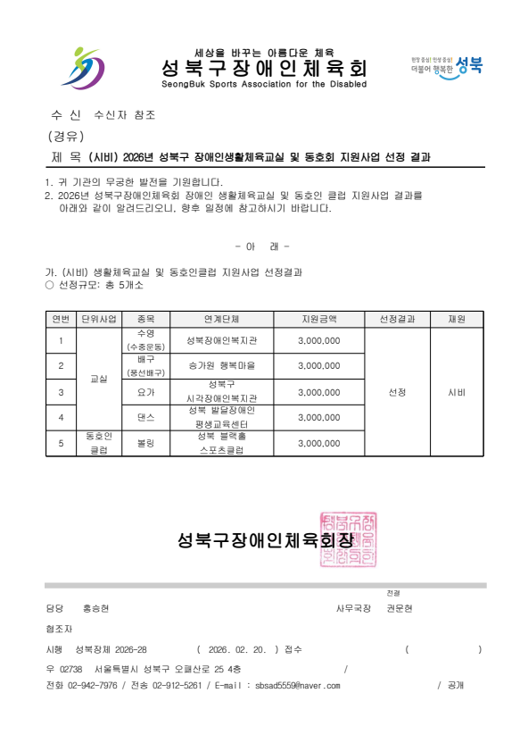 [공문] (시비) 2026년 성북구 장애인생활체육교실 및 동호회 지원사업 선정 결과.pdf (271.4 KB)
