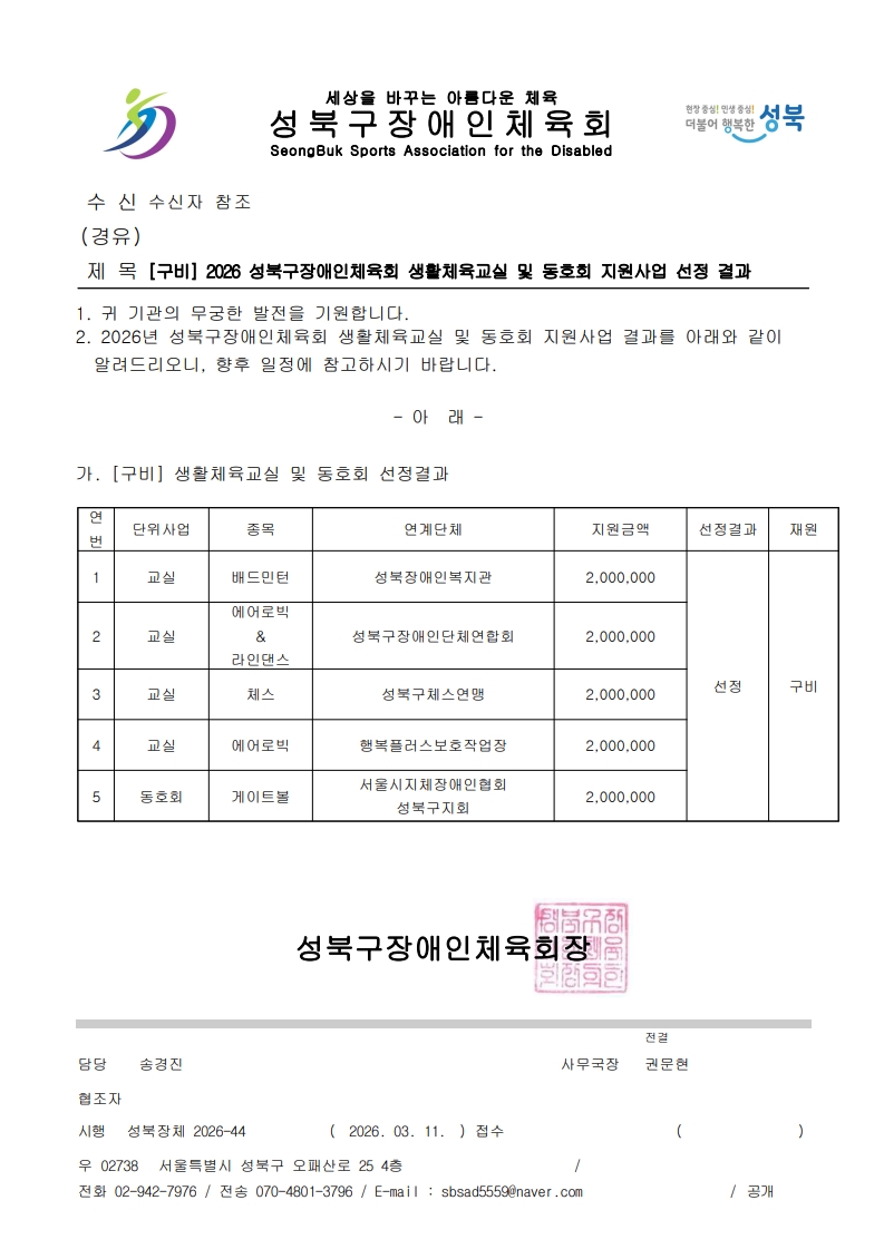 [구비] 2026 성북구장애인체육회 생활체육교실 및 동호회 지원사업 선정 결과.pdf (71.3 KB)