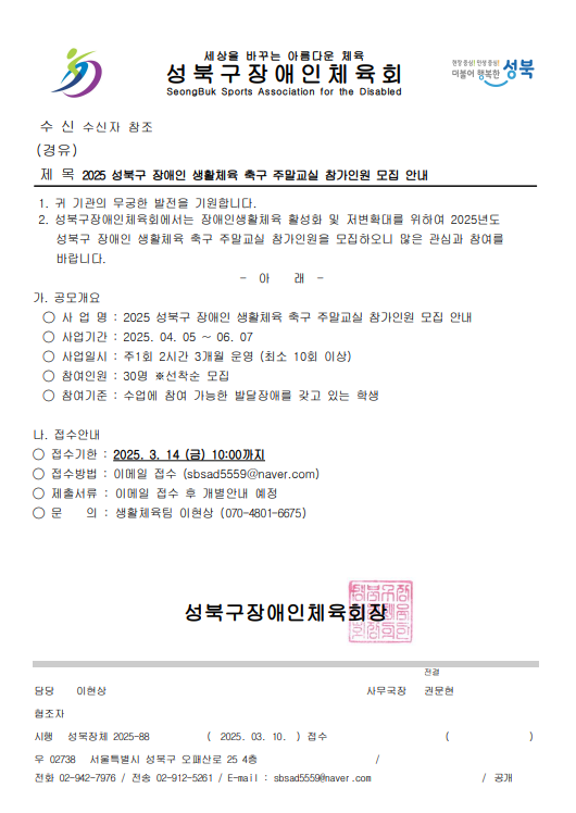 2025성북구 장애인 생활체육 축구 주말교실 참가인원 모집 안내드립니다.