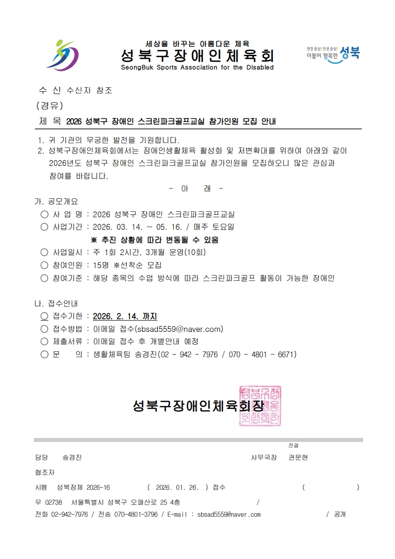 2026 성북구 장애인 스크린파크골프교실 참가인원 모집 안내드립니다.